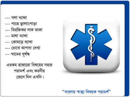 Sisältää erilaisia terveystietoa ja kuvaus yleisten sairauksien, niiden oireita ja ennustetta. Vinkkejä siitä, miten pysyä terveenä. Määritelmä joitakin terveyteen liittyviä termejä, kirjoitettu Bengali.